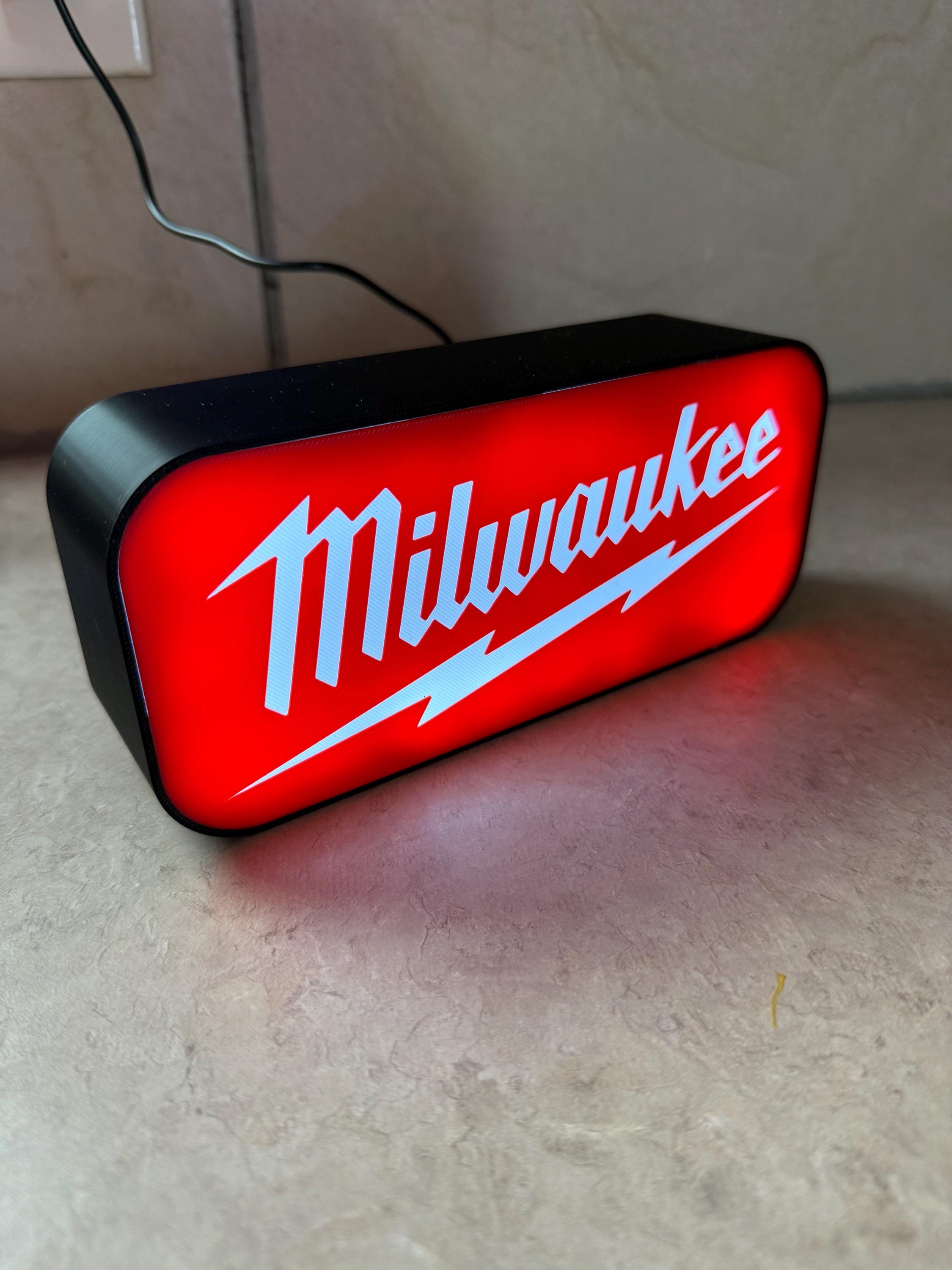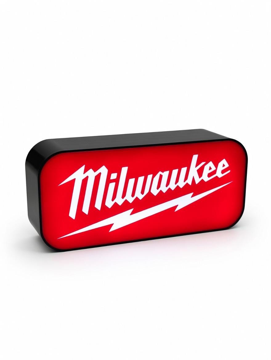 Milwaukee illuminated LED sign. Bright red glow with the classic lightning logo — perfect for a garage, shop, toolbox wall, or man cave.