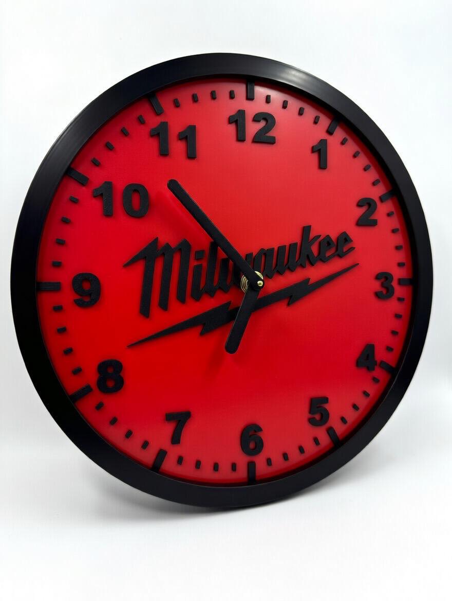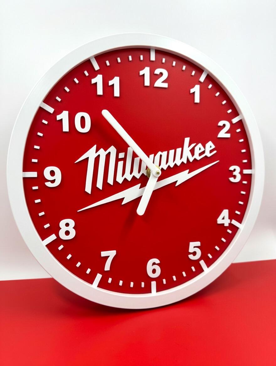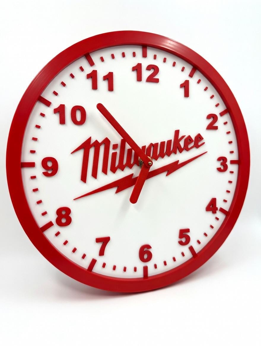Milwaukee themed wall clock. Bright red face with raised white numbers and Milwaukee logo. Runs on a single AA battery and keeps great time. 9.5” diameter! Perfect for a garage, shop, or tool room.