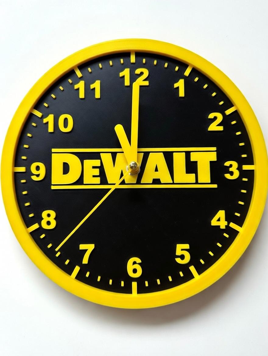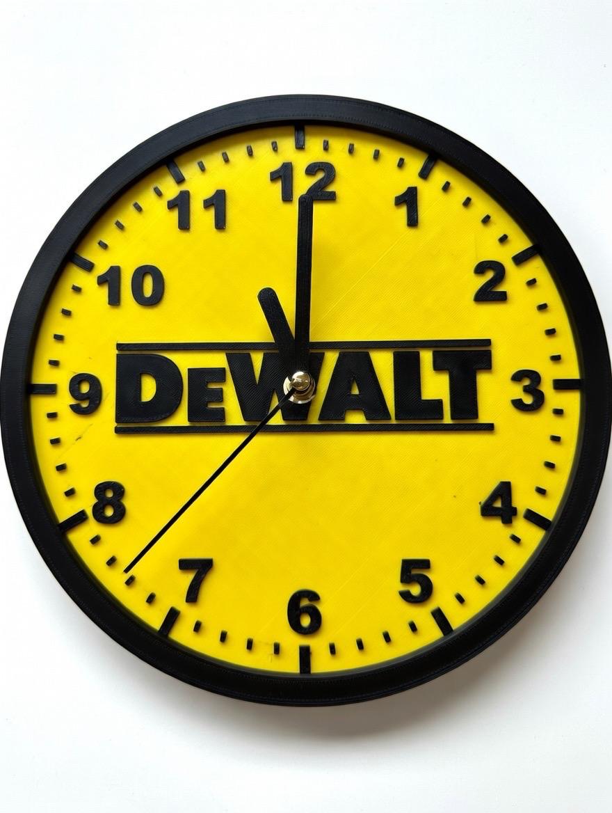 DeWalt themed wall clock. Bright red face with raised white numbers and DeWalt logo. Runs on a single AA battery and keeps great time. 9.5” diameter! Perfect for a garage, shop, or tool room.