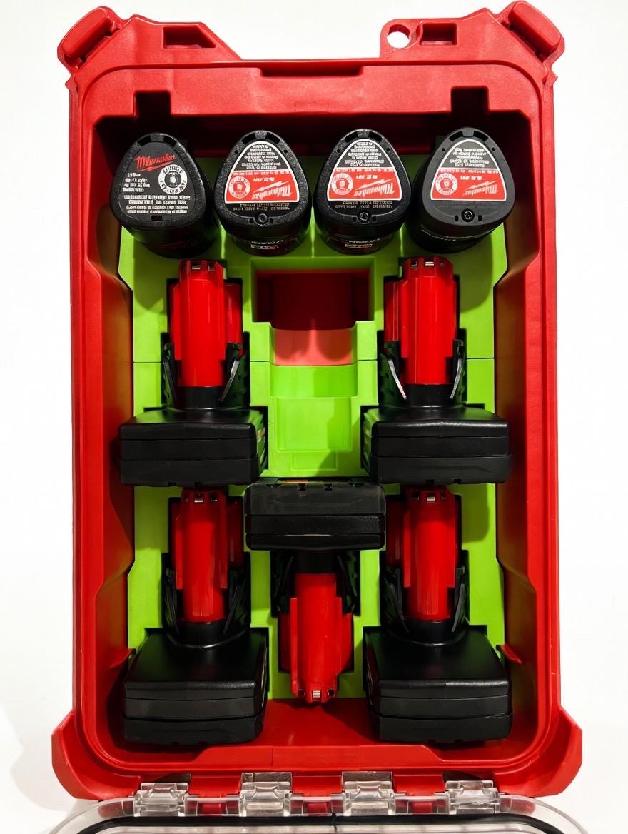 Tired of loose batteries rolling around in your toolbox? This custom organizer keeps your Milwaukee M12 batteries neat, secure, and ready to grab!