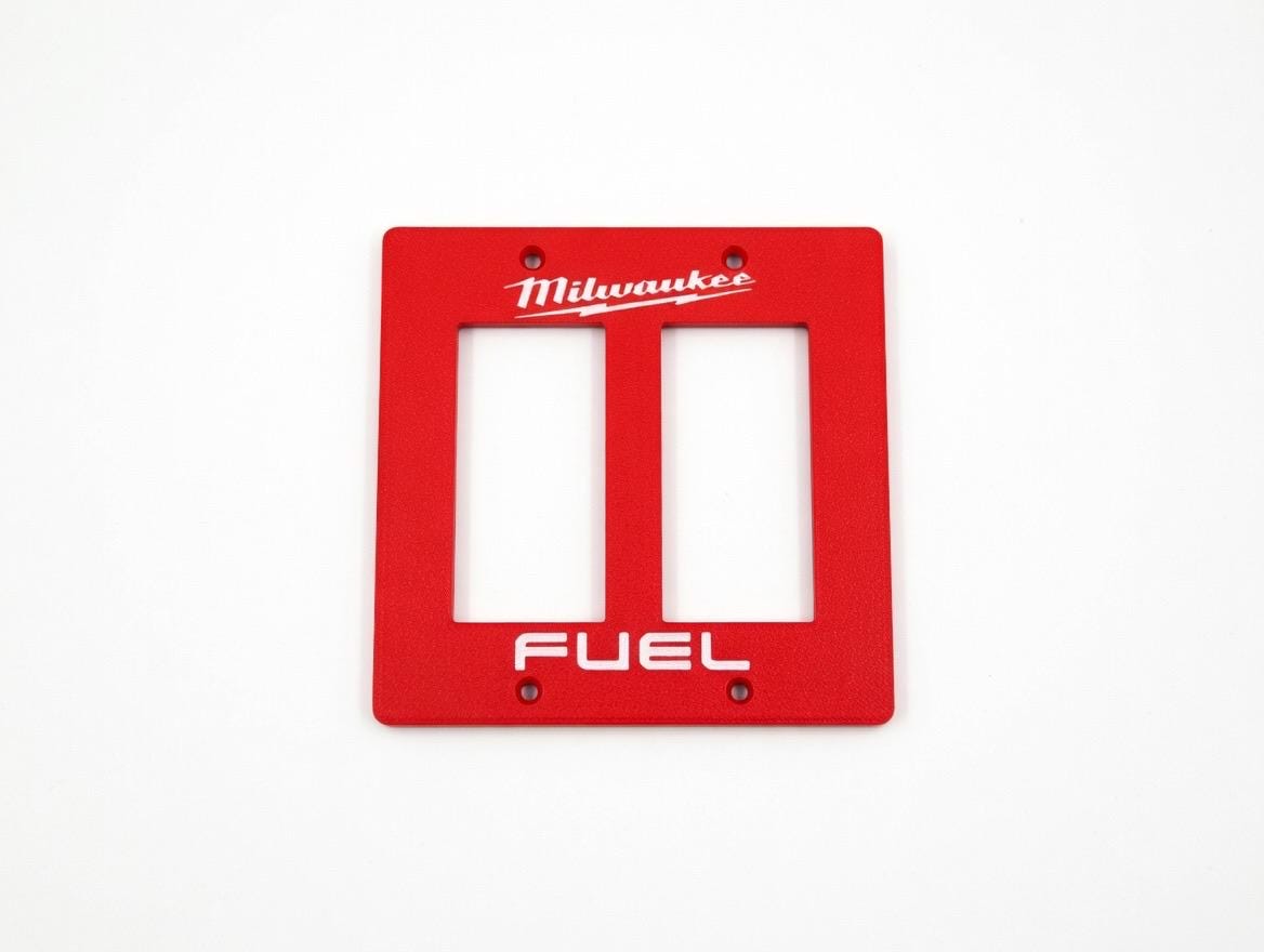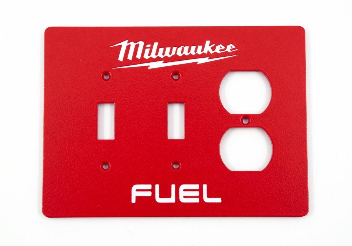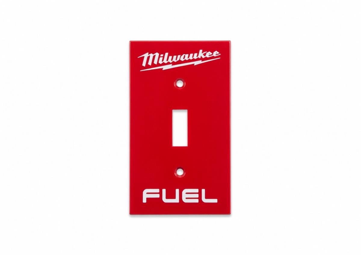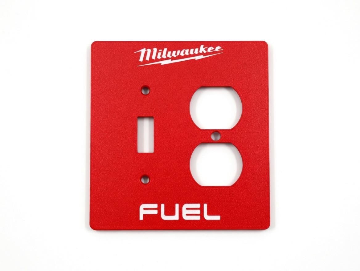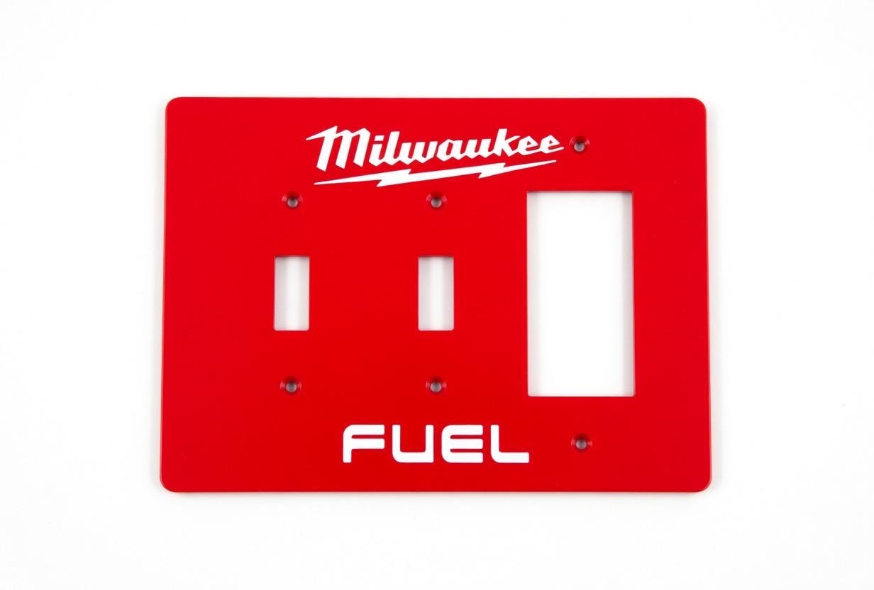 Add some serious Milwaukee FUEL energy to your garage, workshop, man cave, or tool wall! These bold red faceplates feature the iconic Milwaukee script logo with lightning bolt and the classic FUEL branding in crisp white lettering.